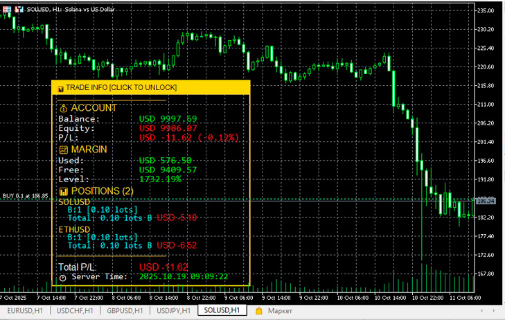 Сделать торговлю более комфортной может специальный скрипт, который выведет всю необходимую информацию непосредственно в ценовом графике. Trading Info Panel RTM — это компактная и в то же время информативная панель для терминала MetaTrader 5, призванная вывести на экран все ключевые показатели вашего торгового счёта и открытых позиций таким образом, чтобы трейдер не отвлекался от графика, не переключался между окнами, и имел «всё под рукой». Лучший брокер 2025 года. Зачем скрипт нужен традиционному трейдеруЕсли вы привыкли работать по-старинке — отслеживать баланс, эквити, маржу, позиции вручную, не любите «избыточную» автоматизацию и цените контроль — этот индикатор окажется полезным по следующим причинам: Он объединяет информацию, которую вы обычно проверяли через окно терминала (баланс, свободная маржа, уровень маржи) и выводит её прямо на график. Помогает не терять нить сделки: видно, какие символы вы торгуете, сколько лотов, какая P/L по каждому инструменту. Подходит трейдерам, работающим в полный экран или на нескольких мониторах: нет необходимости переключаться. С ним можно придерживаться привычной дисциплины торговли — график остаётся центром внимания, всё вспомогательное отображено «на панели». Основные функцииВот ключевые функции, которые делает этот индикатор — с точки зрения того, как он может облегчить традиционный стиль торговли: Мониторинг счёта в реальном времени: показываются баланс, эквити, прибыль/убыток (и процент) — всё видно сразу. Отслеживание маржи: используется маржа, свободная маржа, уровень маржи. Цветовая индикация помогает сразу оценить — «всё в порядке» или «надо быть осторожным». Информация по позициям по инструментам: группировка по символам, количество сделок Buy/Sell, общий объём лотов, P/L по каждому инструменту. Настраиваемый интерфейс: цвета панели, текста, прибыли/убытка; можно менять размер шрифта, тип шрифта, прозрачность, включать/выключать разделы. Перемещаемый интерфейс: панель можно «отпустить» и перетащить в нужное место на экране — удобно, если привыкли держать график как можно чистым. Оптимизирован по производительности: работает на всех таймфреймах, использует минимальные ресурсы, обновляется с настраиваемой частотой (пример по-умолчанию — 500 мс). Для трейдера, который ценит традиционный подход — когда важно видеть «работу счёта и графика в одном Blick-у» — этот инструмент предлагает удобный функционал: меньше переключений, меньше отвлечений, выше концентрация. Скачать Trading Info Panel RTM или установить через маркет МТ5 |