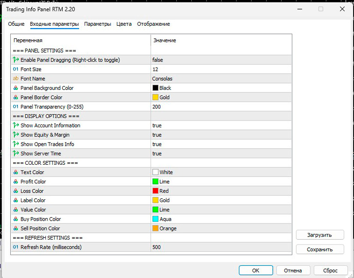 Информационная панель Trading Info Panel RTM