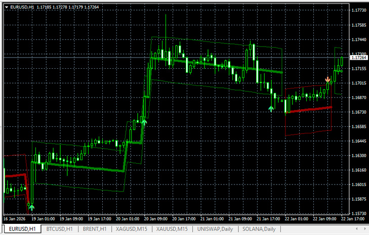 Основная проблема большинства трейдеров — не отсутствие сигналов, а избыточный шум: цена постоянно дёргается, индикаторы часто перестраиваются, а решения принимаются эмоционально. Для структурирования движения и фильтрации ложных импульсов используются трендовые индикаторы с адаптацией к волатильности. Один из таких инструментов — SX Trend Impulse Channels для MT4. Задача индикатора — показать реальную структуру тренда, зону допустимых откатов и моменты, когда рынок действительно меняет характер движения. Принципы работы канального индикатораSX Trend Impulse Channels строит анализ не вокруг отдельных свечей, а вокруг импульсного движения цены. Индикатор оценивает силу текущего движения и перестраивает свою структуру только в тех случаях, когда рынок действительно совершает значимый шаг, а не просто колеблется внутри шума. Пока цена движется внутри допустимого диапазона, трендовая линия и границы канала остаются неизменными. Это позволяет трейдеру видеть стабильную картину рынка без постоянных перерисовок и ложных смен направления. Когда же импульс превышает заданный порог, индикатор фиксирует новый шаг тренда и пересчитывает канал с учётом текущей волатильности инструмента. Ширина канала адаптивна: на спокойном рынке он сужается, на волатильном — расширяется. Благодаря этому индикатор одинаково хорошо работает как на валютных парах, так и на акциях или индексах. После установки в МТ4 вы увидите следующую картину: