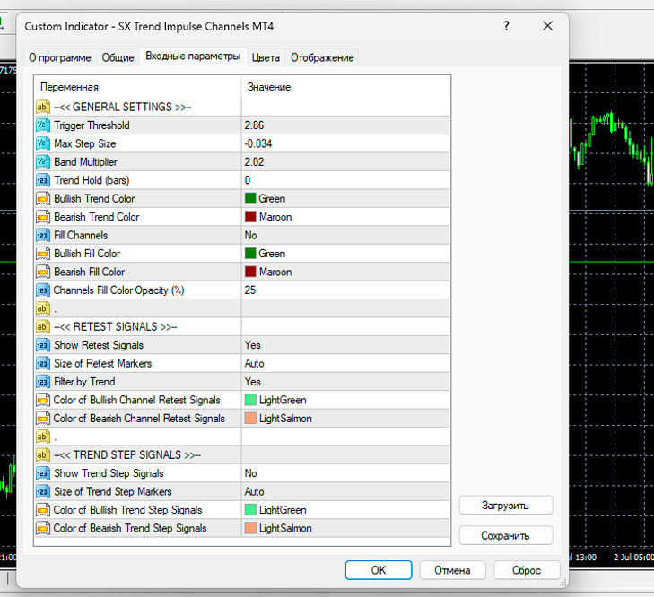 На примере выше показан график EURUSD, таймфрейм H1 с установленным индикатором SX Trend Impulse Channels. Зелёный импульсный канал отражает восходящую фазу рынка. Цена большую часть времени движется внутри канала, формируя последовательные трендовые шаги. Откаты к нижней границе канала используются как рабочая зона для входа в сторону основного движения. В моменты ослабления импульса канал сохраняет форму, не реагируя на краткосрочные коррекции, что хорошо видно на участке бокового движения после сильного роста. Когда же рынок меняет характер движения, индикатор формирует новый шаг и перестраивает структуру — это служит сигналом для выхода из позиции либо отказа от новых входов. Отдельно стоит отметить, что индикатор не пытается ловить развороты, а визуально подчёркивает именно те участки, где рынок движется упорядоченно и предсказуемо. Главные настройки индикатора (что действительно важно)